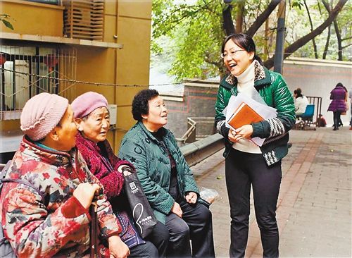 渝中區建交委紀委書記鐘黎(右)到社區聽取居民對社區改造的意見。渝中區紀委供圖