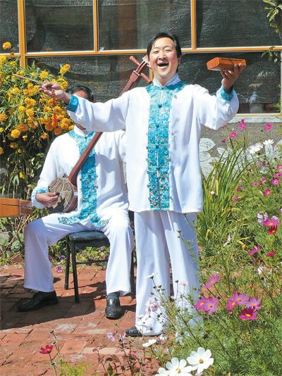 大通文化館曲藝藝人李洪盛為群眾演唱西寧賢孝,宣傳黨的方針政策。