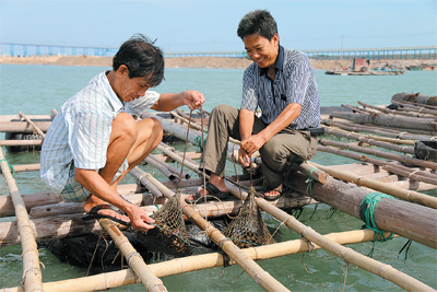 鐵山港區營盤鎮彬塘村是“中國南珠”養殖致富村,圖為星級黨員朱喜源登上浮筏指導南珠養殖。