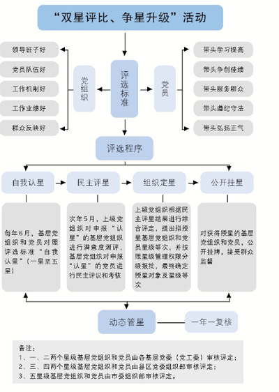 根據不同基層黨組織和黨員特點,建立服務為本、分類量化的評定標准,分別對照五顆星:農村基層黨組織“五星”分別是推動發展星、設施建設星、清潔環境星、培育新風星、和諧促進星,農村黨員“五星”分別是“雙帶”致富星、清潔示范星、參政議政星、新風引領星、和諧促進星﹔城市社區基層黨組織“五星”分別是創業帶富星、服務群眾星、環境整潔星、文明新風星、和諧穩定星,城市社區黨員“五星”分別是志願奉獻星、扶貧幫困星、環境保護星、參政議政星、睦鄰和諧星。