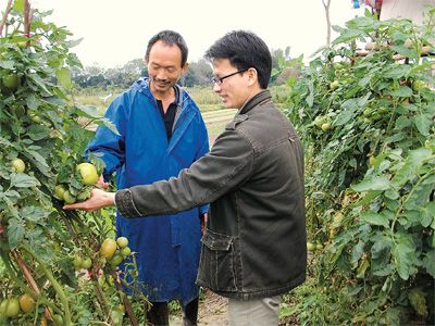 合浦縣山口鎮山口村大學生村官、星級黨員林茂源指導村民種植番茄。