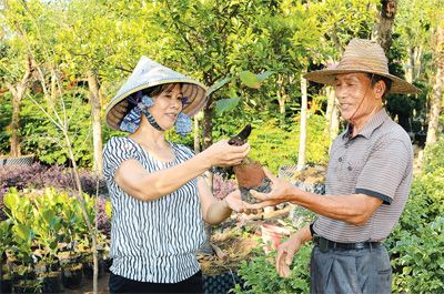 海城區高德街道馬欄村黨總支書記、五星級黨員許利英與村民一起查看榴蓮嫁接苗。