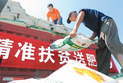 近日,安徽淮南市供銷社組織黨員干部利用自身優勢開展精准扶貧,為定點幫扶貧困村送技術送物資。圖為供銷社干部為壽縣劉崗鎮上樓村142戶貧困戶贈送復合肥。