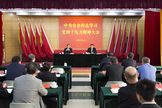 10月24日下午,中央台辦召開傳達學習十九大精神大會。會議由張志軍主持,十九大代表、陳元豐傳達黨的十九大精神並介紹了大會盛況。張志軍對中央台辦認真貫徹落實十九大精神作出動員部署。辦領導、海協會領導、機關全體黨員干部和事業單位班子成員參加了大會。