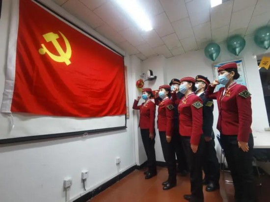 疫情期間,中國鐵路北京局集團公司黨委日均成立135個臨時列車乘務黨支部,積極開展搶運物資、護送醫學專家、服務重點發熱旅客、列車消毒等重點工作,讓黨旗高高飄揚在飛馳的列車上。