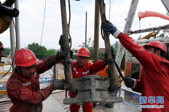 李新民(中)帮助1205钻井队队员打井(2011年6月1日摄)。