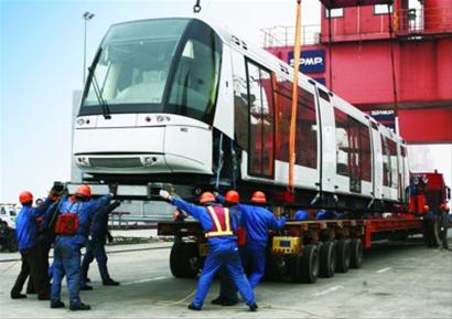 上港集团张华浜分公司将单件重量55吨的地铁机车装上“托斯卡娜”轮。