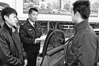 张晓虎(中)正在执勤。记者 朱 磊摄 |