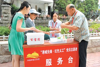 为更好地服务中外游客,展示先锋形象,近期,河北秦皇岛市北戴河区在交通枢纽、重要路段、景区景点设立55个“港城先锋 红色义工”党员志愿服务台,并配备“便民服务百宝箱”,提供藿香正气水、创可贴、红花油等应急药品以及旅游地图、列车时刻表、海蜇防范小贴士,为游客提供暖心服务。