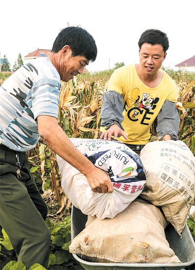 拓展“114惠民服务行动”内涵,以志愿者的真情服务引领群众互帮互助。图为洋口港经济开发区北坎村党总支书记周祥(左)组织党员志愿者为缺少劳动力家庭配送农资。