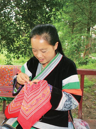 在织金县官寨乡致富带头人的带领下,苗族姑娘正在学习刺绣。