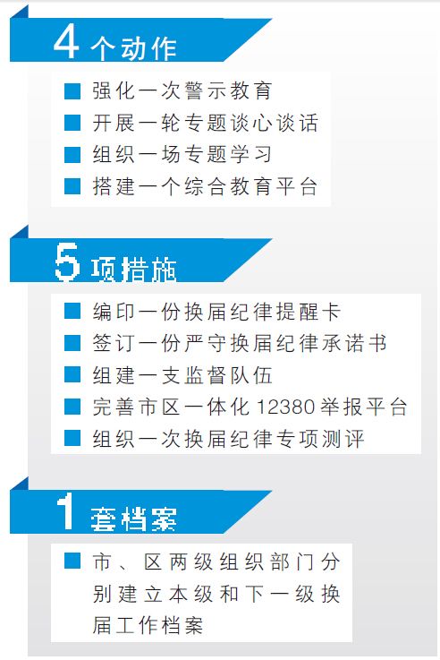 通过全面监督5项措施,该市紧盯关键领域实行全程监督。编印一份换届纪律提醒卡,及早发送给与换届相关的领导干部和工作人员、参加民主推荐人员和“两代表一委员”等重点对象,要求认真学习、自觉遵守。签订一份严守换届纪律承诺书,组织四套班子成员、参加民主推荐人员和“两代表一委员”分别签订《严守换届纪律承诺书》,确保纪律责任直接到人、入脑入心。组建一支监督队伍,抽调精干力量建立巡回督查组,加大对区、镇党委换届风气的巡回督查。督查组全程参与大会选举,对选举工作进行现场监督和指导,扎实开展换届风气民主测评和民意调查。完善市区一体化12380举报受理平台,进一步畅通市、区两级组织部门电话、信访、网络和短信“四位一体”的群众举报渠道,及时受理违反换届纪律问题举报。换届考察和大会选举期间,实行专人24小时值守,实时监测和了解换届风气。组织一次换届纪律情况专项测评,通过问卷调查方式,重点了解换届纪律的知晓度、监督措施的落实程度和干部群众的满意程度,专项测评结果在一定范围内通报。