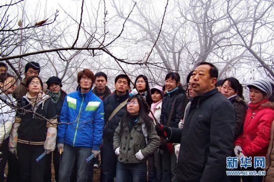 李保国(前)带领学生实习(2009年11月29日摄)。 新华社发