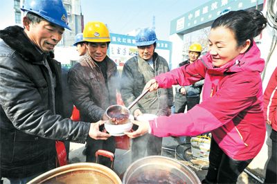 去年腊八节,泉山区矿山社区党委为辖区建筑工人送去热腾腾的“腊八粥”。