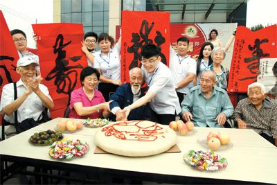 铜山区“夕阳红”志愿者服务队和社区工作人员为百岁老人祝寿。