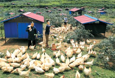 西秀区鑫堡村第一书记李翔(中)争取项目、协调资金,推动村民林下养鸡,发展循环经济。