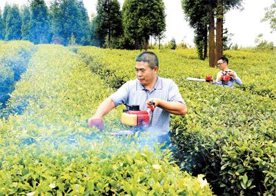 西秀区枝杨村第一书记杨洪亮(左)指导种茶合作社社员修剪茶树,手把手传授技术。