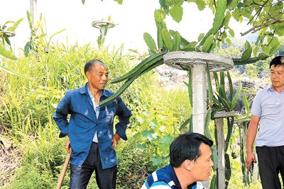关岭自治县莲花村第一书记周齐兵(左二)利用劳动小憩时间,为村民讲解山地农业发展前景。