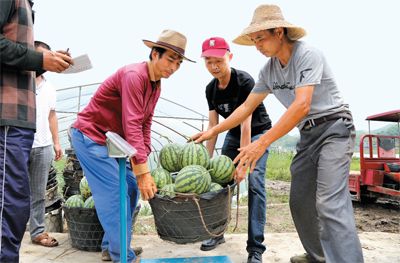 镇宁自治县扁担山乡虹映村第一书记韦慷(右二)和村民一起收摘西瓜。