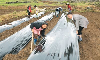 安顺经济技术开发区和兴村第一书记何孝友(右一)帮助村民覆盖地膜。
