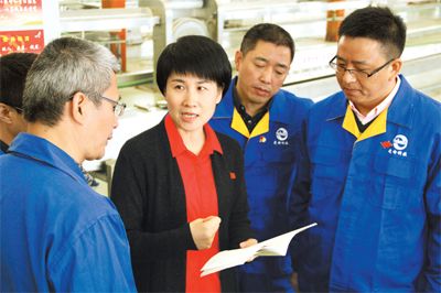 浙江富春江通信集团有限公司党委副书记章勤英(右三)走进生产车间,为一线党员上党课。 孙亚男 吴洪云 摄