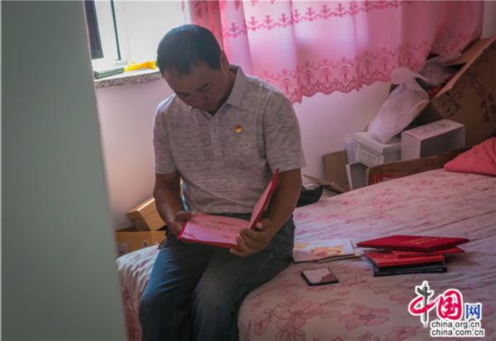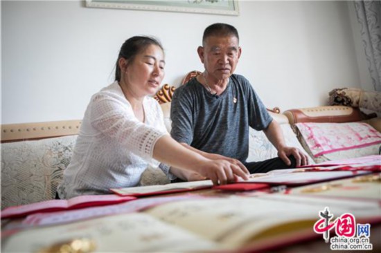 王平丈夫黄应明翻看妻子的证书。中国网记者 伦晓璇 摄