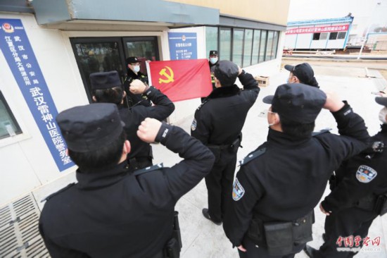2月7日,武汉市公安局江夏区分局大桥派出所雷神山医院警务室挂牌成立。图为警务室民警向党旗宣誓。