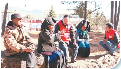 四川省凉山彝族自治州盐源县棉垭镇纪检监察干部(右一、右三)走访群众。 |